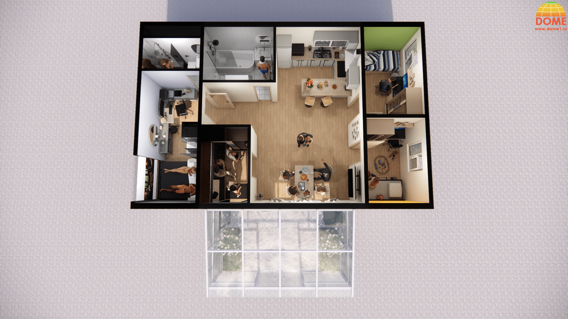 2-3 спальни: Подходит для небольшой семьи или пары с ребенком. Можно добавить детскую комнату или рабочий кабинет.